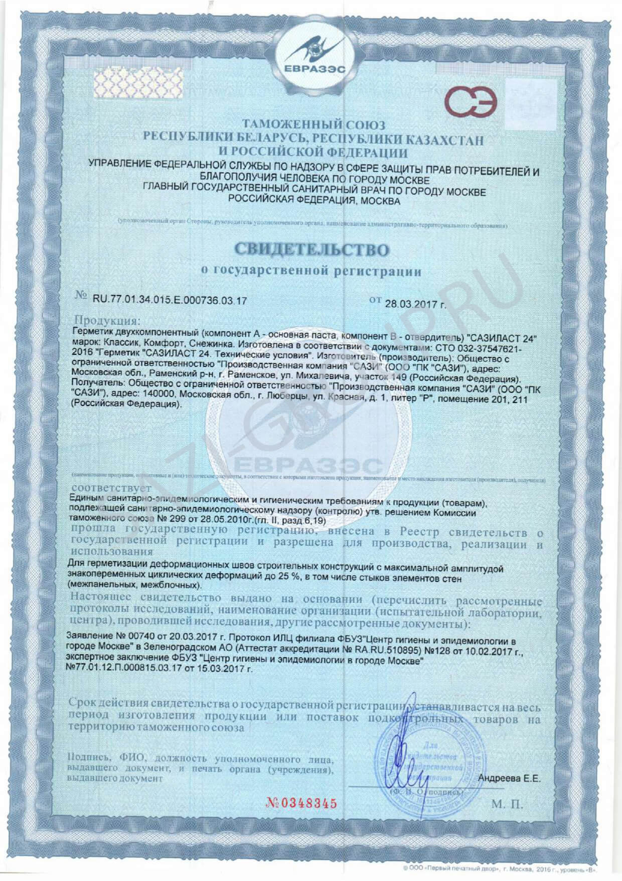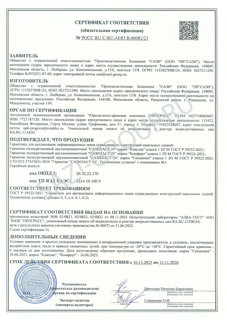Двухкомпонентный полиуретановый герметик, предназначен для герметизации стыков в панельном домостроении с максимальной амплитудой знакопеременных циклических деформаций до 25%. Долговечность герметизации при правильном применении Сазиласта 24 составляет не менее 15 условных лет эксплуатации.